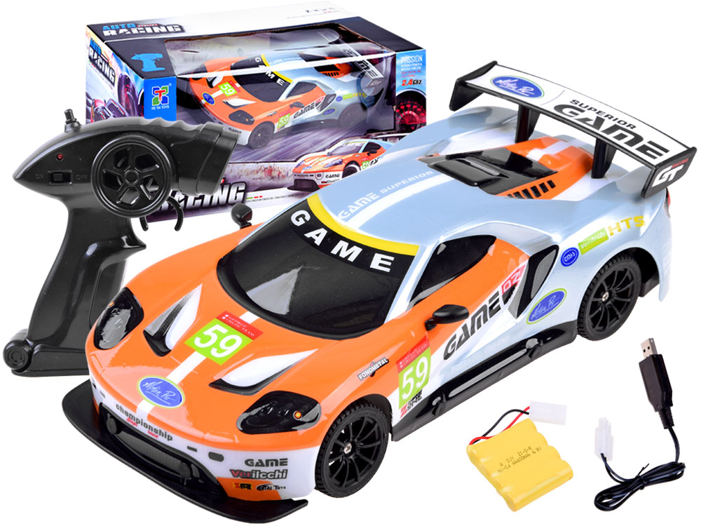 Športové auto určené na zábavu pri pretekoch, učenie sa riadiť bude fungovať počas mnohých hier. Auto je nízko posadené na gumových kolesách s efektívnym a ľahkým telom určeným na jazdu vpred, vzad a otáčanie nabok. Auto so skvelou, športovou grafikou, ľahkou a flexibilnou karosériou. Gumové, široké pneumatiky veľmi dobre priľnú k zemi, vďaka čomu auto šikovne vchádza do zákrut. Automobil ovládaný ergonomickým diaľkovým ovládaním 2,4 GHz zaisťuje pohodlné ovládanie vozidla.