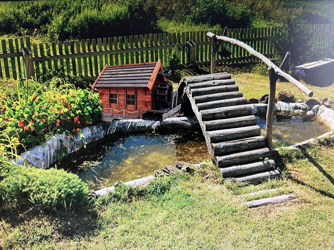 Má otočné mlynské koleso a priekopu, po ktorej tečie voda.