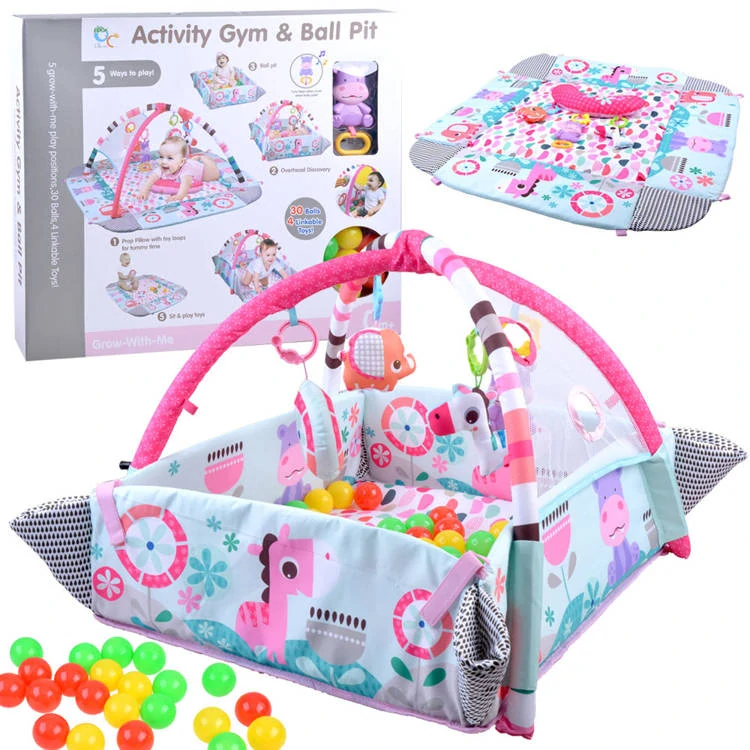 JOKO Hracia deka, podložka na hranie, ohrádka pre deti 5v1 + 30 loptičiek + oblúk s hrkálkami + vankúš, ružová