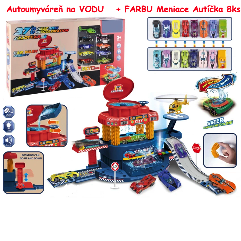 JOKO Detská Autoumyváreň na VODU + 8 autíčok s MENIACOU Farbou