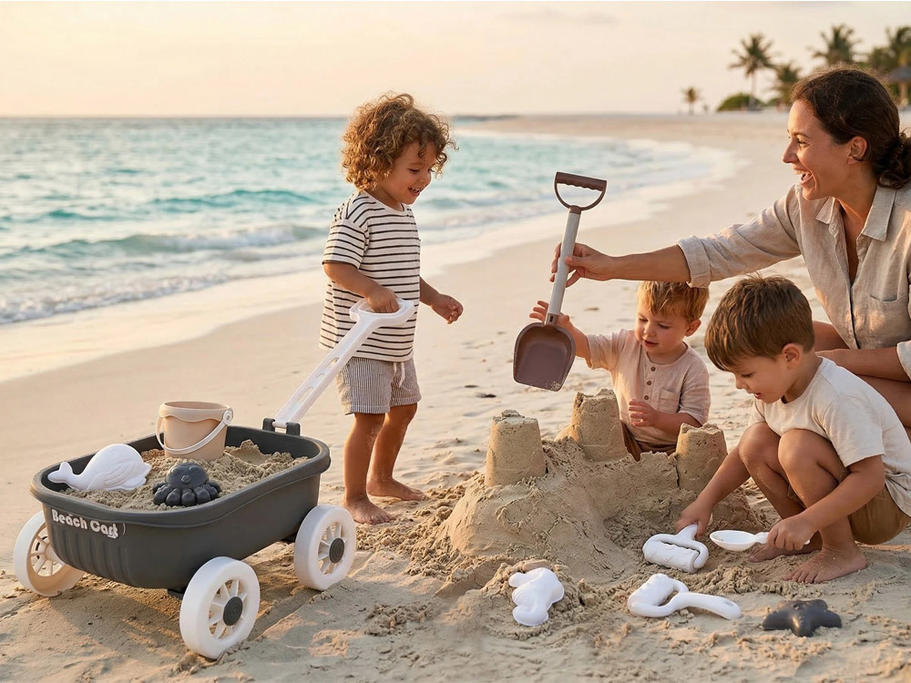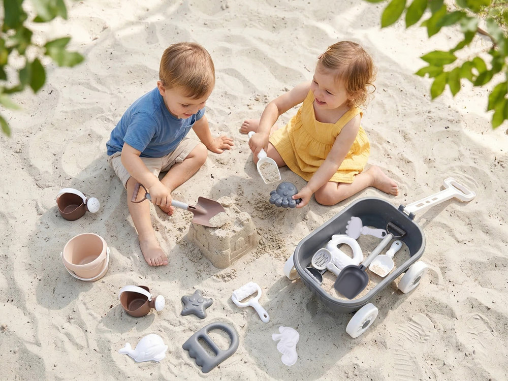 Sada obsahuje praktický vozík na hranie v piesku, ktorý uľahčuje prepravu všetkého príslušenstva. Deti si môžu pohodlne prepravovať svoje hračky a zároveň si počas hry rozvíjať samostatnosť a organizáciu.