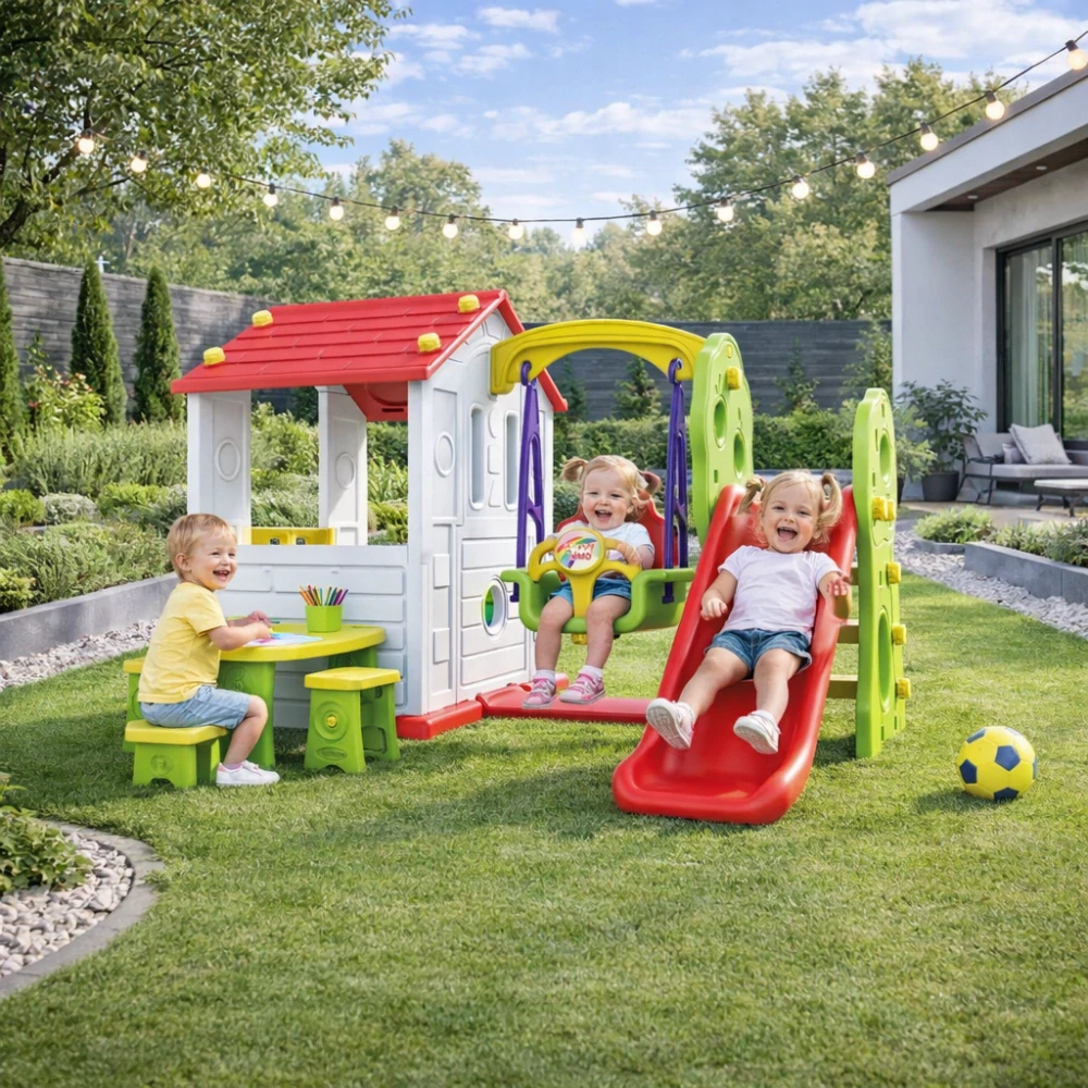 Prestavujeme Vám nádherný záhradný Plastový domček, ktorý poteší každé dieťa a postará sa o hodiny zábavy na Vašom dvore alebo terase. Domček je vybavený hojdačkou a tiež stolom s lavičkami. Takže Vaše deti si môžu svoj obed vychutnať v záhrade alebo maľovať alebo hrať s plastelínou vonku na priestrannom stole.