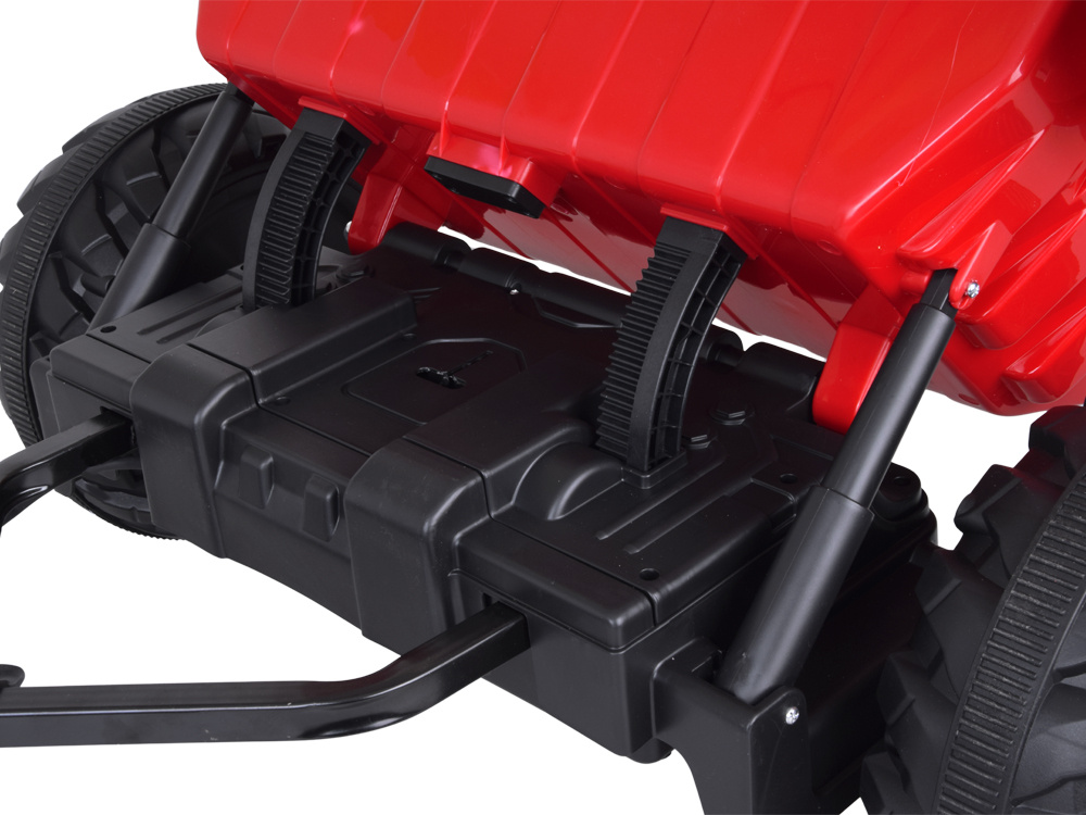 Traktor je vyrobený z odolného plastu a sedadlo potiahnuté ekokožou zaisťuje pohodlnú jazdu. Vozidlo je vybavené bedrovým pásom na stabilizáciu dieťaťa počas používania.